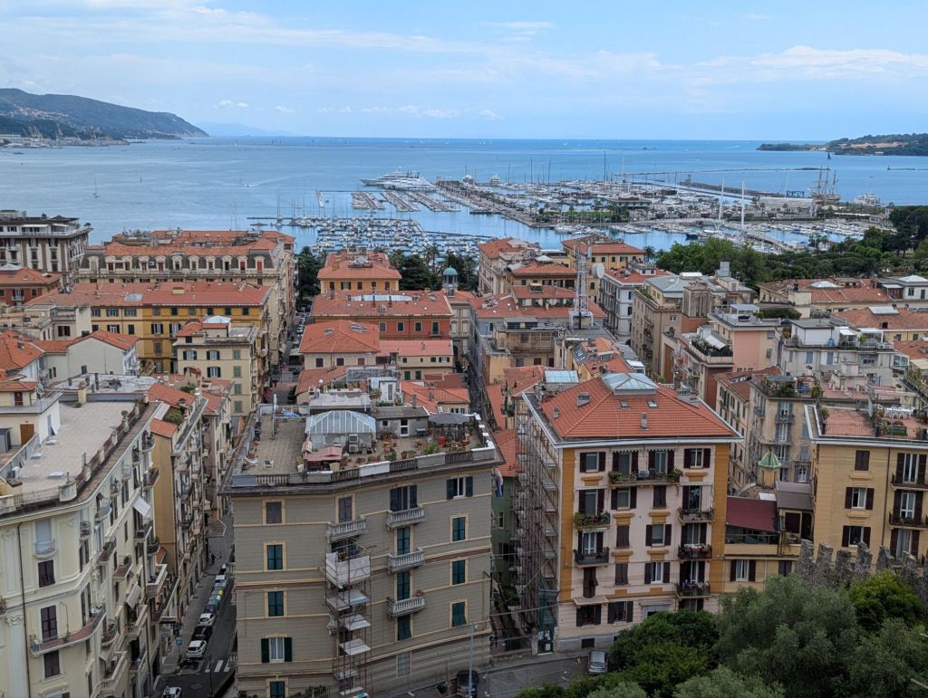 Our goal for the afternoon was to tour the aforementioned fortress, Castello San Giorgio and take in the view overlooking the city and harbor. There were two options to reach the top; a free elevator to the first plateau and then a free funiculaire for the second leg, and then a sturdy climb to the gate leading into the museum and upward to 2 terraces for the spectacular view. The other option was 600 stairs. The funiculaire ride was smooth and entertaining.