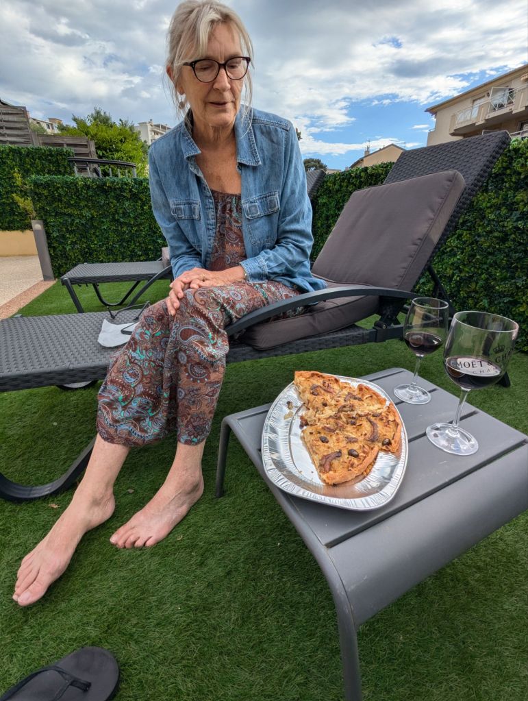 Alain’s mother, Suzanne, is very sweet. She has already brought us an onion tartalette with olive and anchovies and then the other evening Alain brought us out their homemade limoncello in the most amazing glasses. The colour and taste were to my liking and I will try my hand at making it when we return (along with learning to do Italian tile work, making french pastry, playing piano, exercising, and…)