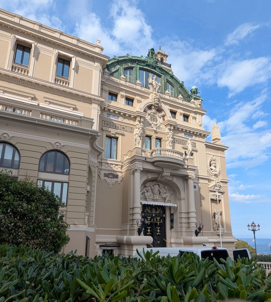 Still there is grandeur all around. The architecture is top tier and in every direction. We start walking hoping to find the information center close by, but it is above us by the famous casino. The heat is building and were trying to get our bearings and thankfully a shop keeper and then a bus driver steer us in the right direction and soon we are heading uphill by bus to the casino area. This is the steepest terrain that we have encountered yet and walking was out of the question. We’re released near the info center and get the lowdown on the major parts of the city, with the casino as the epicenter. We walk downhill towards the casino (what a great concept, walking downhill) and stand before it in minutes surrounded by Bentleys, Rolls, and Ferraris. Shows of excess are the norm and the Hôtel de Paris Monte-Carlo’s luxurious facade and the Hotel Hermitage behind it epitomize what life with no constraints will bring you.
